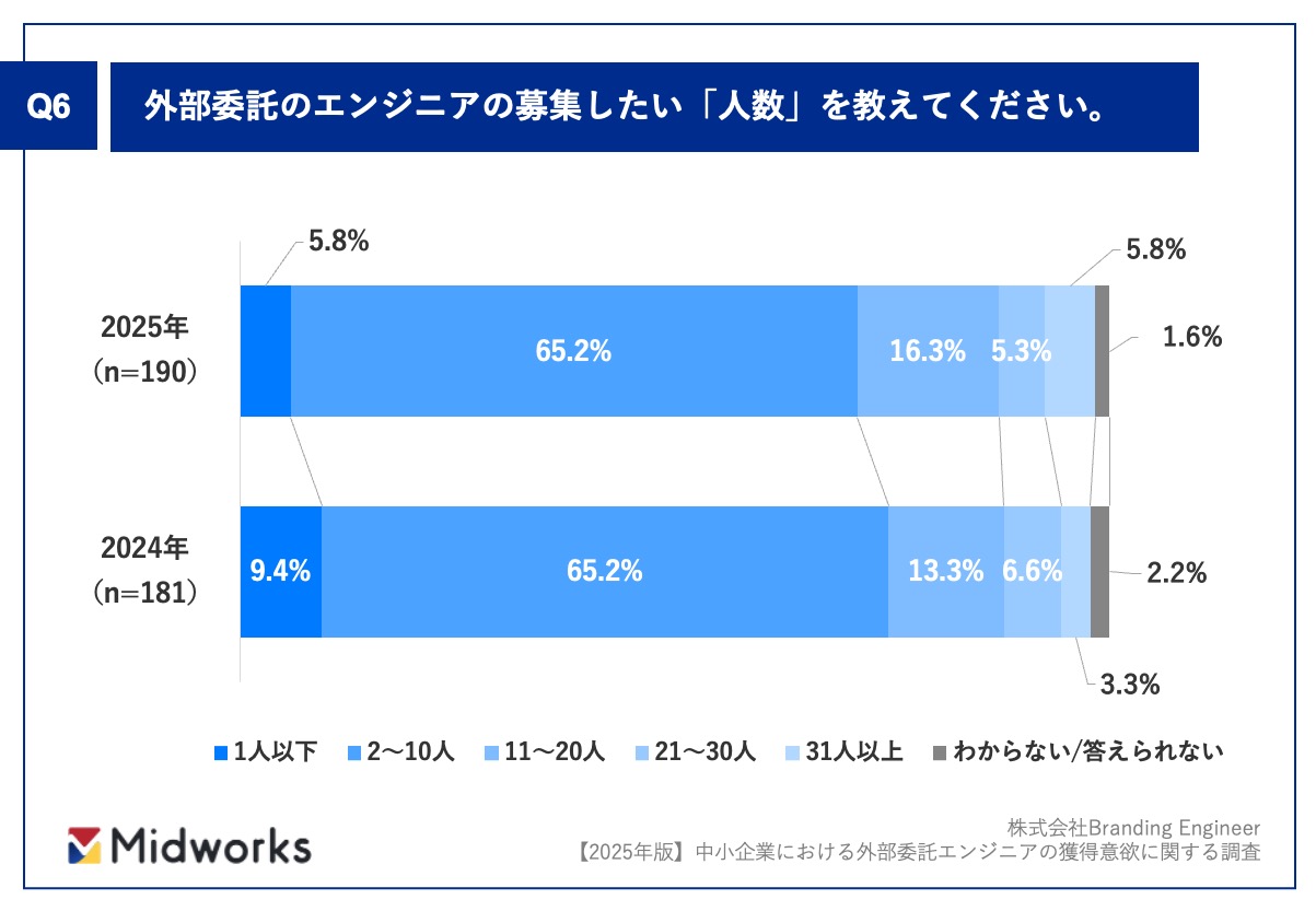 「Q6. Q1で「かなり意欲が高い」「やや意欲が高い」と回答した方にお聞きします。外部委託のエンジニアの募集したい「人数」を教えてください。」(n=190)と質問したところ、「2~10人」が65.2%、「11~20人」が16.3%という回答となりました。